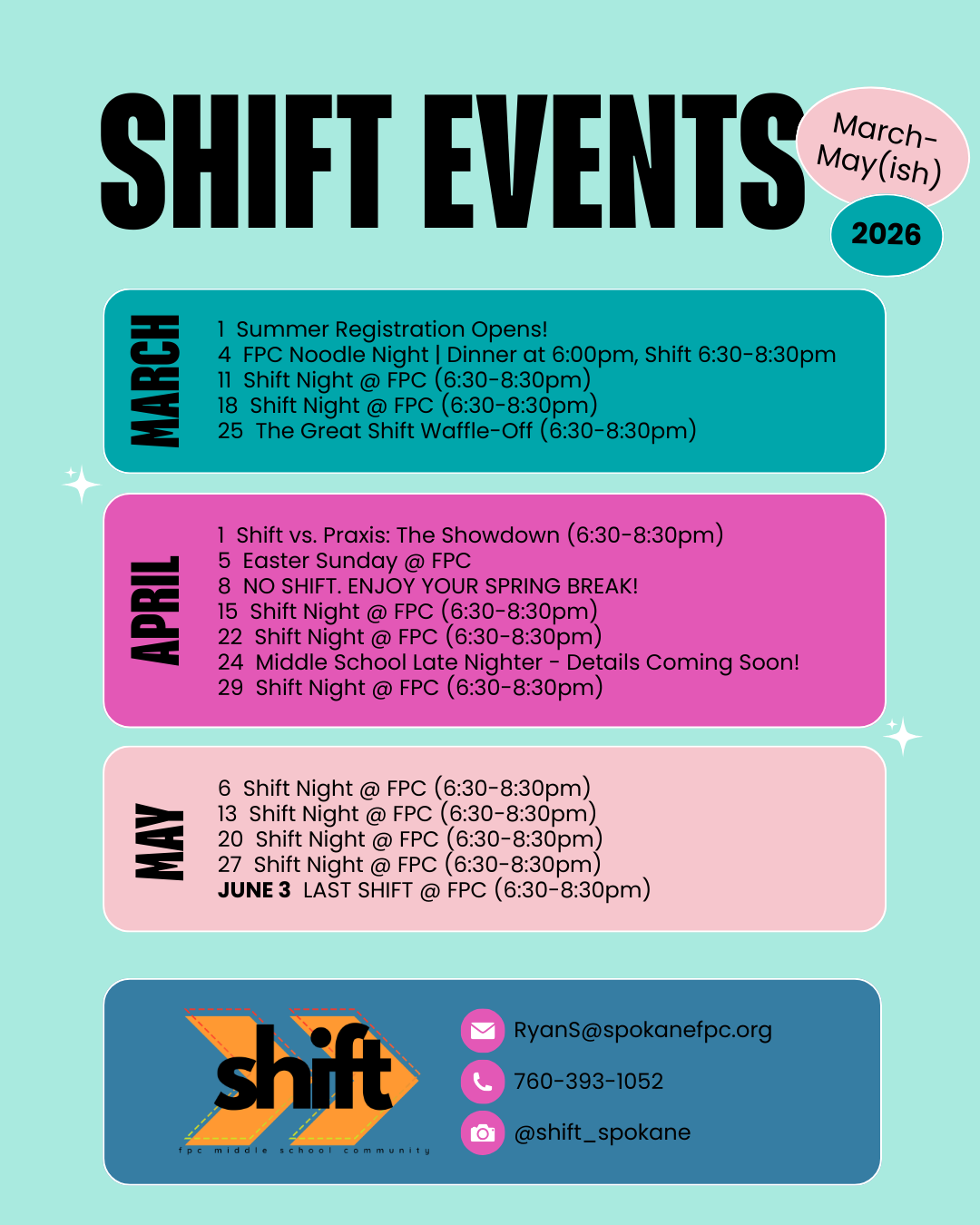 Welcome to Shift! We meet Wednesday nights from 6:30-8:30pm during the school year. Shift is a ministry specifically designed for 6th, 7th, and 8th graders. It is a place where we come to laugh, play, make new friends, worship and learn about God!